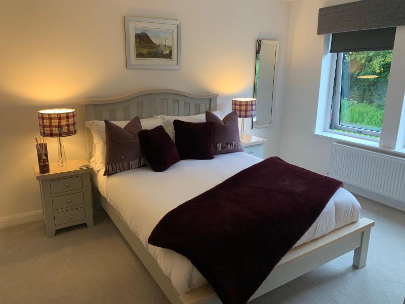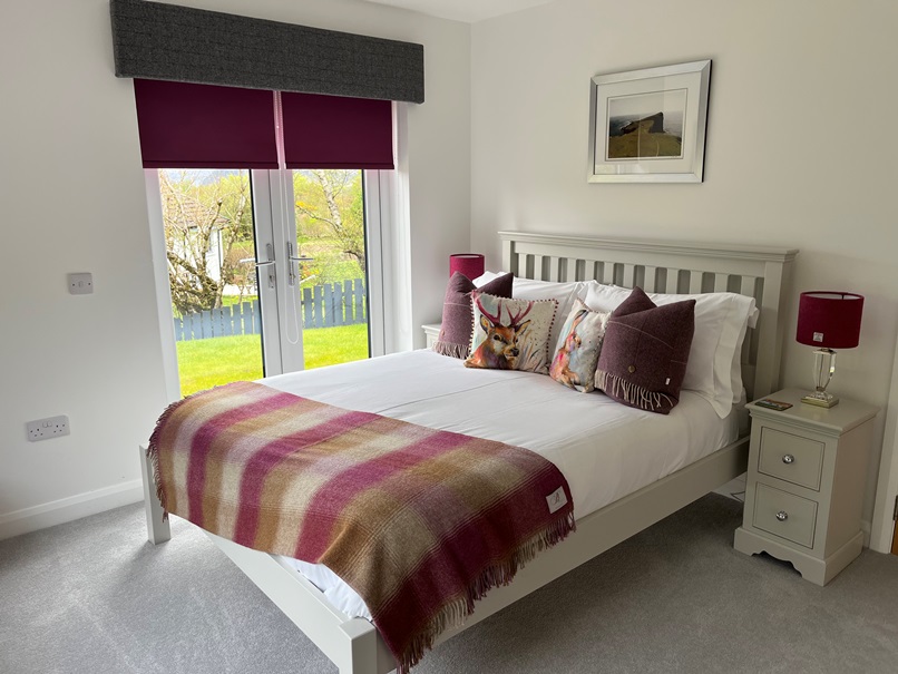 This en-suite bedroom is dual aspect with double windows to the front of the property and a patio door on the gable end looking at the grassy lawn and towards Ben Tianavaig. The king-size bed has soft and firm pillows depending on your preference, luxuriously soft Egyptian cotton bed linen, dressed with tweed scatter cushions and throw. It has a walk-in fitted wardrobe, 32 inch Smart television, hairdryer, full length mirror and vanity stool. The finishing touches on the window pelmets and bedside lamp shades are in the local Harris Tweed.
