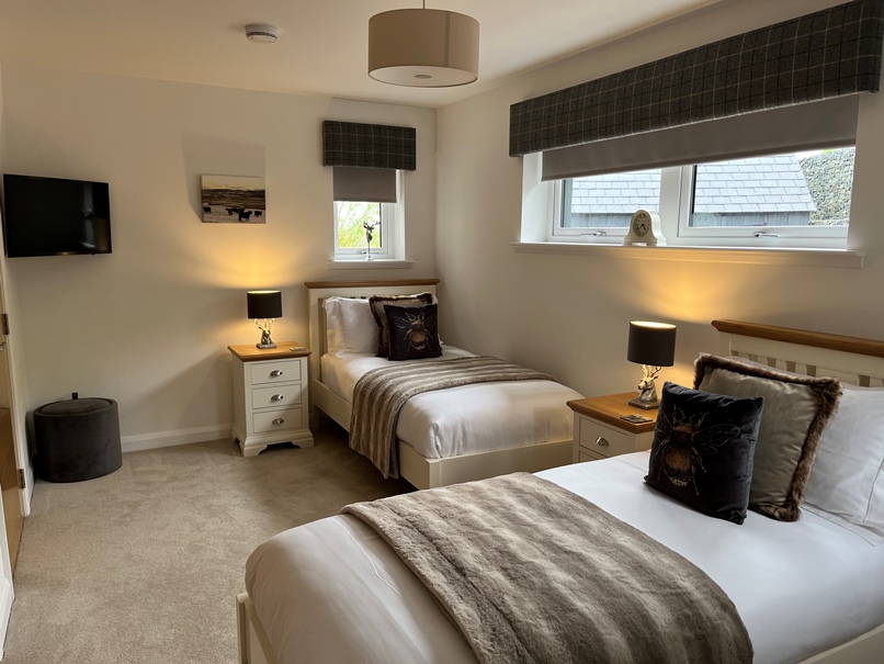 This triple aspect room is located at the rear of the property, looking towards Ben Tianavaig. It is equipped with two single beds, soft and firm pillows depending on your preference, luxuriously soft Egyptian cotton bed linen, dressed with scatter cushions and throws. It has a walk-in fitted wardrobe, 32 inch Smart television, hairdryer, mirror and vanity stool. The finishing touches on the window pelmets are in a dark grey and stone coloured tweed.